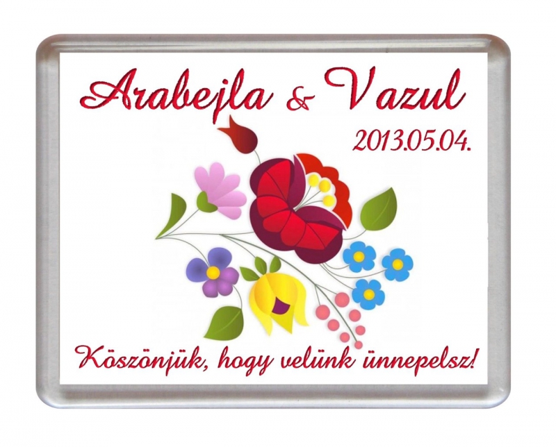 Legkedveltebb köszönetajándékaink egyike a kedves grafikával díszített esküvői hűtőmágnes. A feliratot tetszőlegesen választhatod.